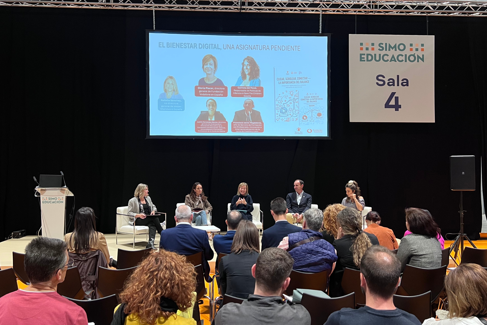Fundación Vodafone ha celebrado la mesa redonda “El bienestar digital, una asignatura pendiente” durante la primera jornada de la feria SIMO Educación, celebrada en IFEMA Madrid. En ella han participado Gloria Placer, directora general de Fundación Vodafone en España; Carmela del Moral, responsable de Políticas de Infancia de Save The Children España; Judith Fernández Novoa, directora general de Ordenación e Innovación Educativa de la Consellería de Educación, Ciencia, Universidades e Formación Profesional de la Xunta de Galicia; Francisco Javier Magdaleno, Jefe de Servicio de Formación del Profesorado, Innovación e Internacionalización de la Junta de Castilla y León, y, como moderadora, Natalia Sánchez, co-directora general de Weber Shandwick. Durante la mesa redonda se ha debatido sobre la importancia de proteger el bienestar digital de las y los más jóvenes y proporcionarles herramientas para proteger su propio bienestar digital.